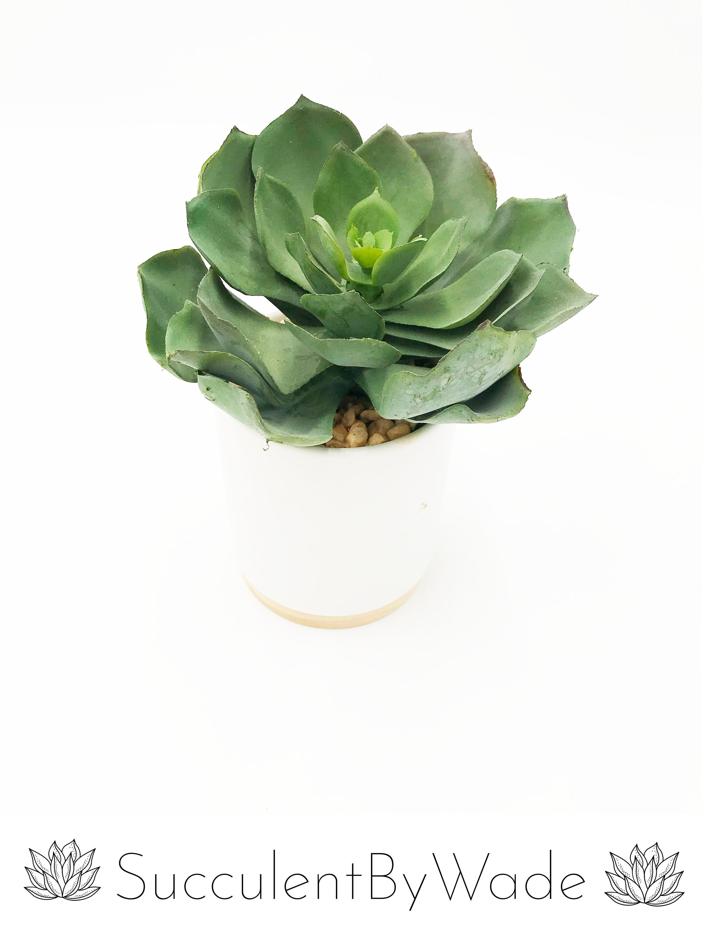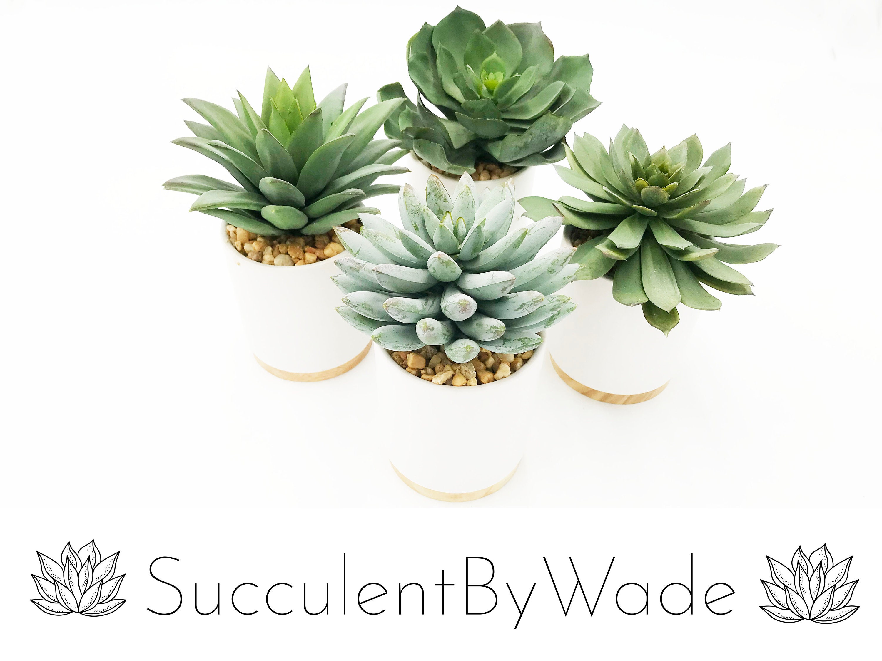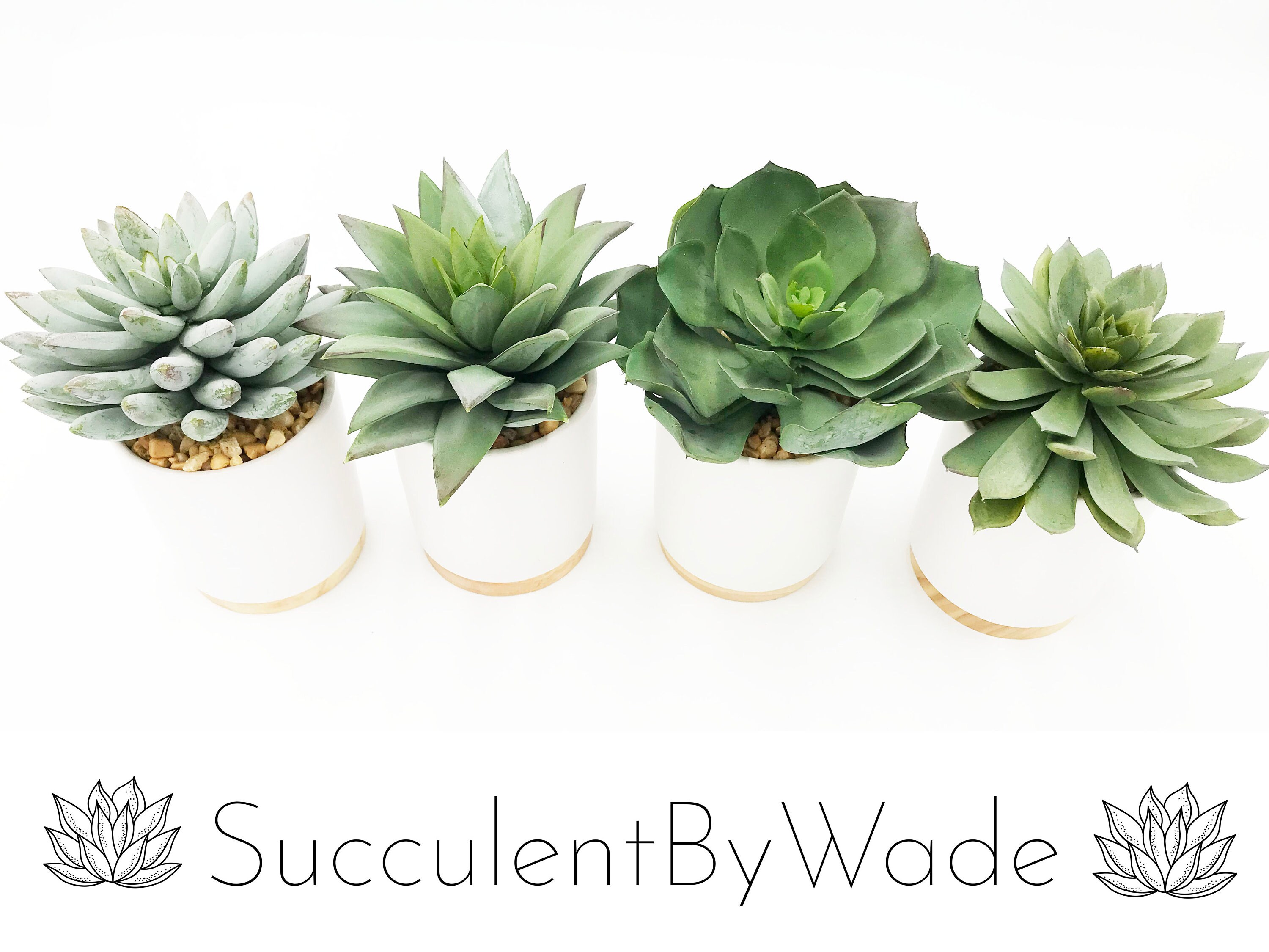 Set of 4 different, beautiful succulent arrangement, using high quality materials. The arrangement sits within a contemporary white container with the florals set in a beige rock garden. The pictures don’t do this arrangement justice. It’s a stunning addition to anyone’s home or office.