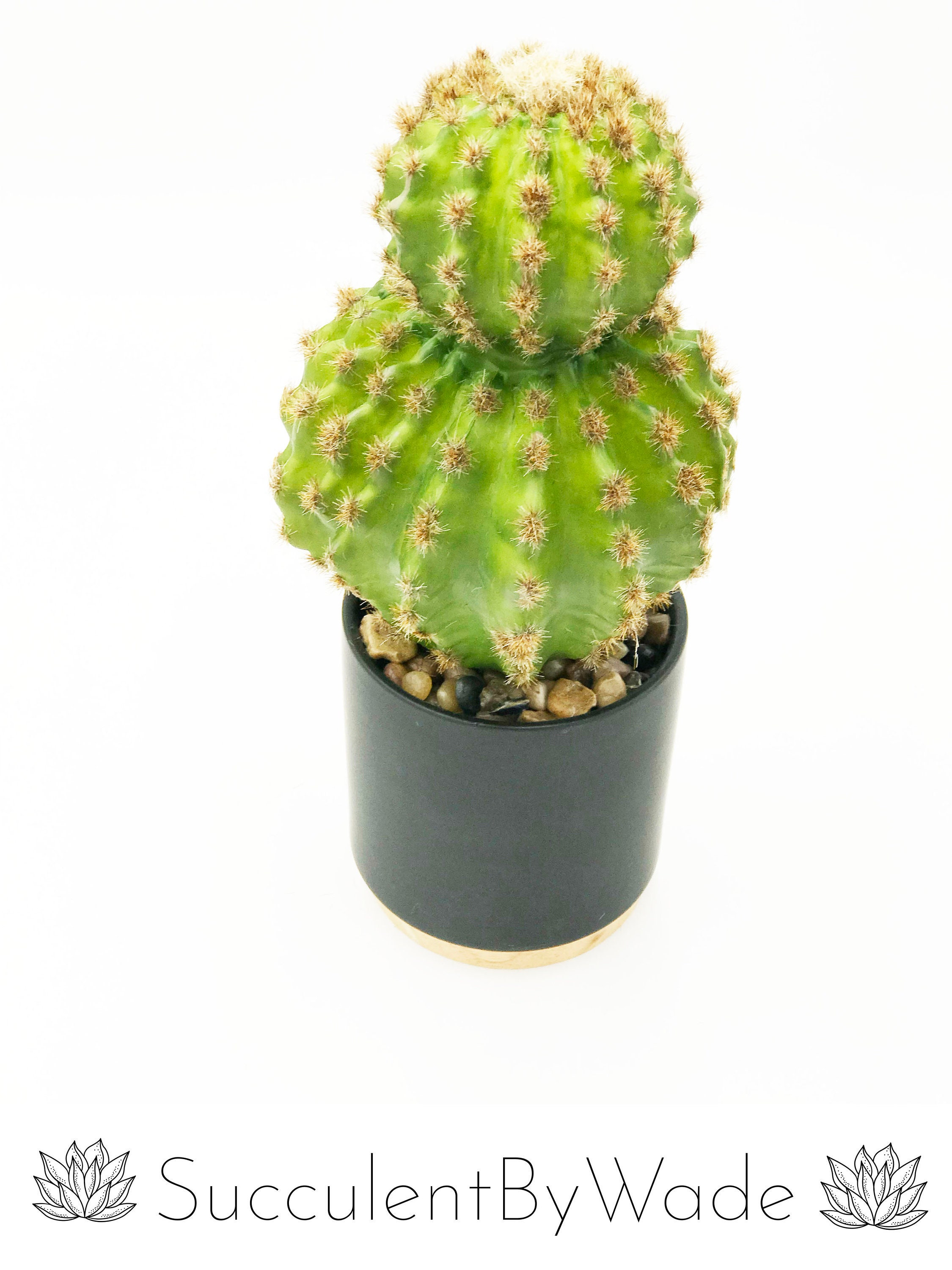 Beautiful faux cactus arrangement, using high quality materials. The arrangement sits within a beautiful, contemporary black pot with the cactus set in a beige rock garden. The pictures don’t do this arrangement justice. It’s a stunning addition to anyone’s home or office.